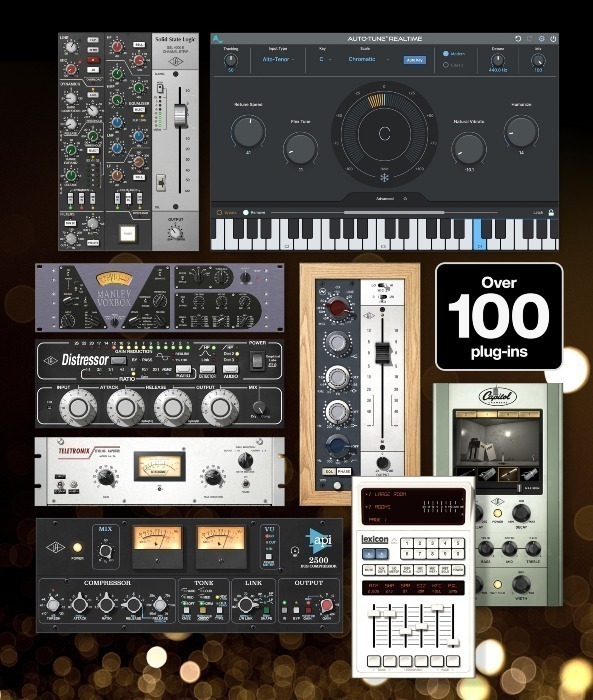 Plug-In Selection: Includes a vast collection of UAD plug-ins, more extensive than the Essentials+ edition, offering tools from classic brands like Neve, SSL, Auto-Tune, and more.