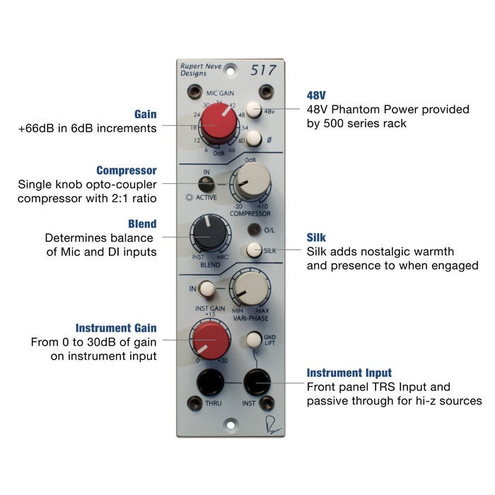 De Portico 517 is een "Lunchbox" 500-series formaat DI, Mic Preamp en Compressor. De Portico 517 levert de volwaardige sound van de mic pre en compressor uit de Portico range in het zogenaamde 500 series "lunchbox" (API) formaat. DE 517 is uitgerust met de magische Silk functie en biedt met de variabele faseregeling en mixfunctie tussen DI en Mic Pre een ideale oplossing in veel recording en live situaties waar zowel DI en microfoon technieken gebruikt worden zoals akoestische en versterkte instrumenten.