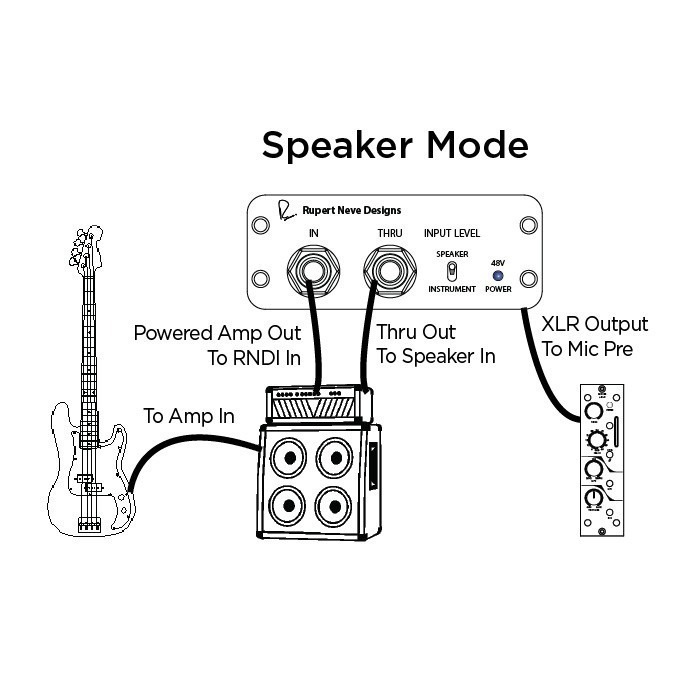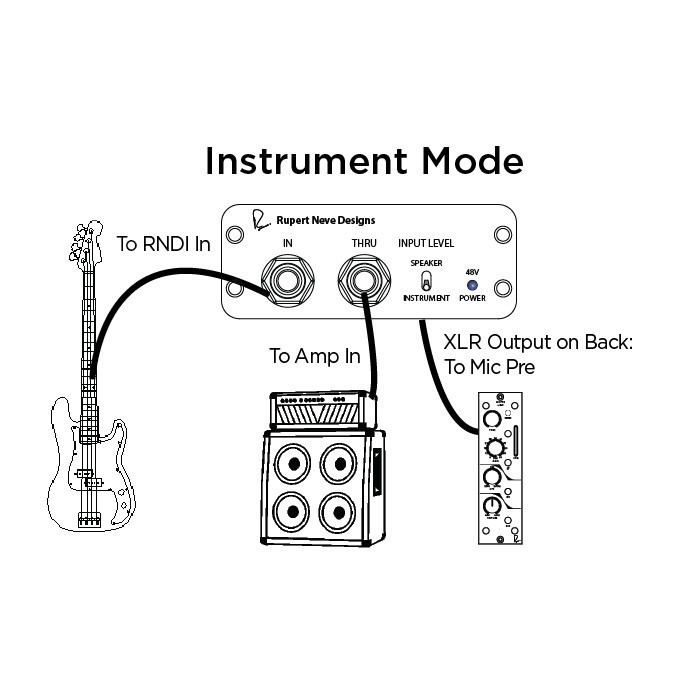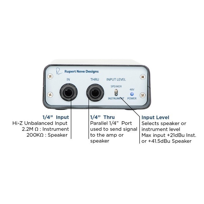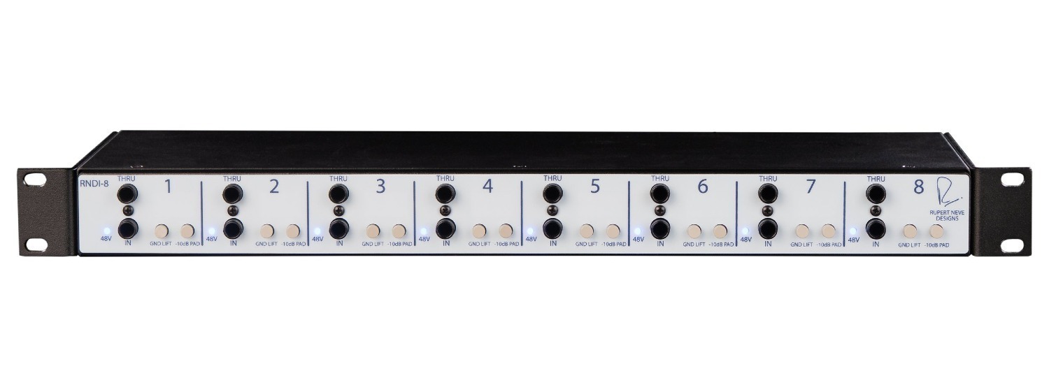 De Rupert Neve Deigns RNDI is een hoogwaardige DI met een rijke, diepe en volle klank met een uitzonderlijke helderheid zonder enige toegevoegde hardheid. De RNDI maakt gebruik van een door Rupert Neve ontworpen Klasse-A transformator en discrete FET versterkers. Hij heeft een robuuste metalen behuizing en wordt gevoed via een 48V fantoomvoeding. De ingang kan geschakeld worden tussen instrument en speaker level. Zodoende kan zowel een instrument als een versterkeruitgang rechtstreeks worden aangesloten. In de instrument modus heeft de RNDI een headroom van maar liefst + 21.5dBU, hierdoor kan elke lijnbron worden aangesloten zonder een pad. De speaker modus kan een eindversterker van maximaal 1000 Watt worden aangesloten om de volledige klank van het instrument, voorversterker, EQ, inserts, en eindtrappen van de versterker vast te leggen. Zodoende kan de FOH technicus werken met de totale sound zonder bijgeluiden zoals bij een microfoon.