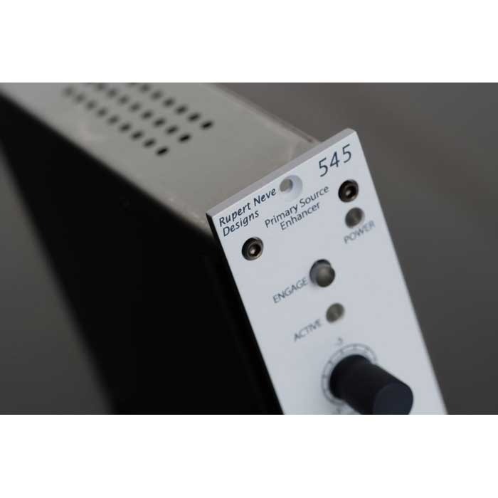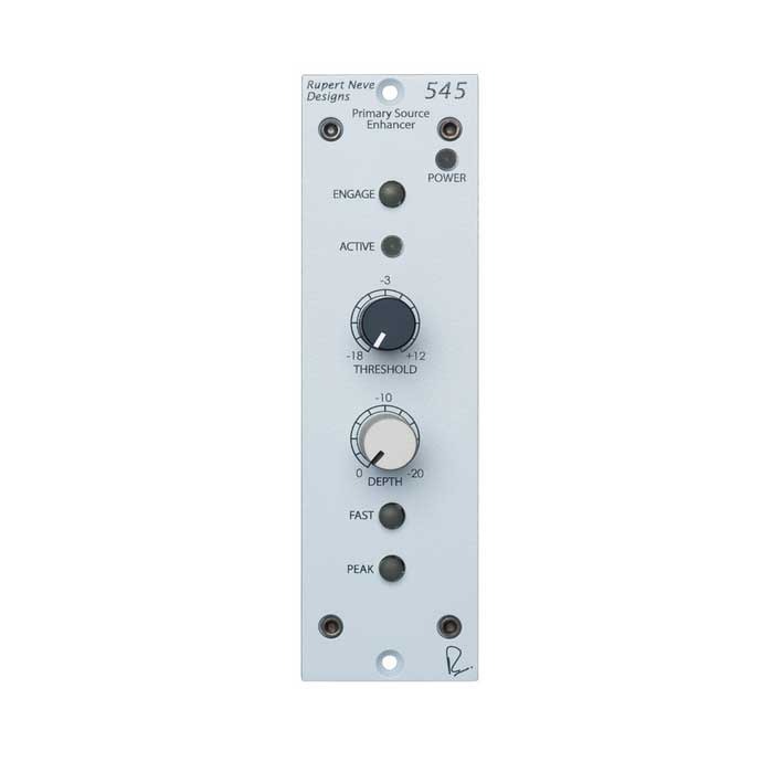 Delivering the world’s most natural feedback reduction and adding focus to your primary sources, the 545 is a truly unique tool for improving your live sound.Based around the circuitry in the acclaimed Portico 5045 – which has benefited countless tours, arenas, houses of worship and broadcast stages worldwide – the 545 is a mono device for vocal or instrumental applications, and is compatible with any 500-Series rack. Exceptionally useful at reducing feedback without negatively impacting the sonic integrity of the source, the 545 effectively increases the level of a live microphone signal before feedback occurs by up to 20dB. With simply laid out, easily adjustable controls, the 545 is an invaluable addition to any setup where feedback or reverberation are problematic.All Analogue DesignThe 545 shares some traits with conventional "noise gates", but operates on a different principle. One common aspect is that both reduce the gain during the absence of signal – or more specifically, both begin to attenuate when the level of a signal falls below a certain user-defined threshold. The 545 senses when someone is speaking or singing into the mic and allows the signal to pass through, and senses when the person has stopped talking or singing and reduces the gain appropriately, reducing the system’s tendency to feed back.Importantly, the 545 does not utilize filtering or digital processing to achieve its significant benefits. Built around Rupert Neve Designs’ custom input and output transformers, its all-analog circuitry provides superb control and sonic performance without compromising the integrity of the source material. This makes the 545 the most intuitive, natural-sounding and effective method of feedback reduction available on the market.Simple, Intuitive ControlsWith a minimal control set, the 545’s ease of use makes it ideal even for circumstances where a full-time or experienced engineer is not readily available, and allows for rapid adjustments on-the-fly even during performances.EngageIlluminated push-button that engages the Primary Source Enhancer’s effect.ActiveThis LED indicates when the 545 is actively affecting signal – a.k.a. when the input signal has overcome the enhancement threshold. Since this LED should generally be illuminated when the desired source is present (a vocalist singing, for example) it is extremely helpful in setting up the 545 for use.ThresholdSets the dBu level at which the Primary Source Enhancer engages.DepthThe DEPTH knob controls the maximum amount of effect from the 545 – or in other words, how much attenuation is applied after the input signal falls below the set THRESHOLD. By rotating the DEPTH control clockwise from 0dB towards -20dB, the 545 will attenuate the input signal more dramatically, letting the user find the perfect balance between audibility of the Primary Source Enhancement effect and feedback reduction.FastThe FAST control is an illuminated push-button that selects between two available time constants, tuning the 545’s response by determining how quickly the attenuation occurs in the quiet sections between words or phrases. Without this button pressed, the 545 achieves a slower attack and release that is useful as a starting point for most sources. Pressing the FAST push-button engages the faster attack and release time constant, useful on more dynamic sources or passages where faster transient detection is necessary.PeakIlluminated push-button that selects between RMS and Peak detection modes. When illuminated, the 545 is in PEAK mode – useful for detecting faster transient peaks, and for creative dynamic envelope shaping. When not illuminated, the 545 is in RMS mode, which utilizes a slower, more averaged response characteristic in the sidechain.