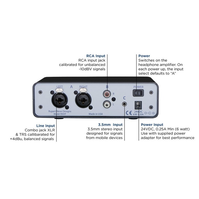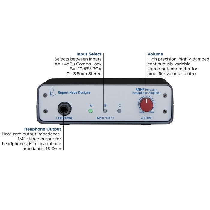Whether you’re tracking, mixing, or just listening to music, your headphone amplifier is as important to the final sound quality as your headphones – yet the world is full of headphone amps with compromised sonics, headroom, and power. To address these shortcomings, Rupert and his team at Rupert Neve Designs have developed the RNHP.Based on the headphone output circuit in the 5060 Centerpiece Desktop Mixer, the RNHP is a dedicated 24V reference-quality headphone amplifier with specifically-calibrated +4dBu balanced line, unbalanced RCA and 3.5mm (1/8”) inputs, housed in a rugged VESA-mountable steel chassis. With effortless, wide-open sonic performance and the ability to drive any pair of headphones without compromise, the RNHP allows you to perform, mix and enjoy your music with a new level of clarity.Dedicated vs Integrated AmplifiersFor much equipment, the headphone output is an afterthought. Most products with integrated headphone amps have large feature sets, small footprints, and relatively low price points. This leads to comprised power and audio quality of the headphone amplifier itself, which can lead to a number of issues in real world usage such as low headroom, unreliable performance, and a lack of focus.The RNHP was made to accomplish one simple purpose: making any headphones sound their best. As a dedicated design, the RNHP is tailored to deliver extremely high quality, powerful amplification, with precise calibration for any source input. This exceptional level of quality can be the difference that inspires an artist to give their best performance, lets an engineer make better choices in mic and placement, gives a mix engineer reliable translation of EQ and dynamics adjustments, or lets a music listener appreciate the full depth and detail of a recording.Specially-Calibrated Inputs For All of Your DevicesIn addition to being able to drive a wide variety of headphones without sacrificing performance, the RNHP is also capable of receiving a wide array of signals with its 3 inputs, calibrated for optimum level and impedance. Check the Application notes for how the RNHP can be utilized for different purposes.VESA-Mountable DesignThe RNHP is designed for mounting with any VESA 100 compatible mount. These may include pole mounts, wall mounts, table mounts, or articulating arm mounts. These mounts can help to ensure the RNHP is always in the perfect position.Multiple-Line FeedIn some situations where you only have one set of outputs but need to simultaneously feed the RNHP and another device such as speakers, a second headphone amplifier, or a 2-track recorder, we recommend using splitter cables from the Left and Right line outputs to feed both devices from the same stereo pair.