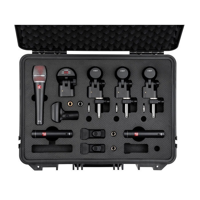 The V PACK ARENA consists of one V KICK for your bass drum, three V BEATs and V CLAMPS for your toms, one V7 X for your snare, and a pair of sE8 condensers for your overheads. All mics and accessories come securely packaged inside a robust plastic flight case, with an empty space included to accommodate your favorite hi-hat mic.