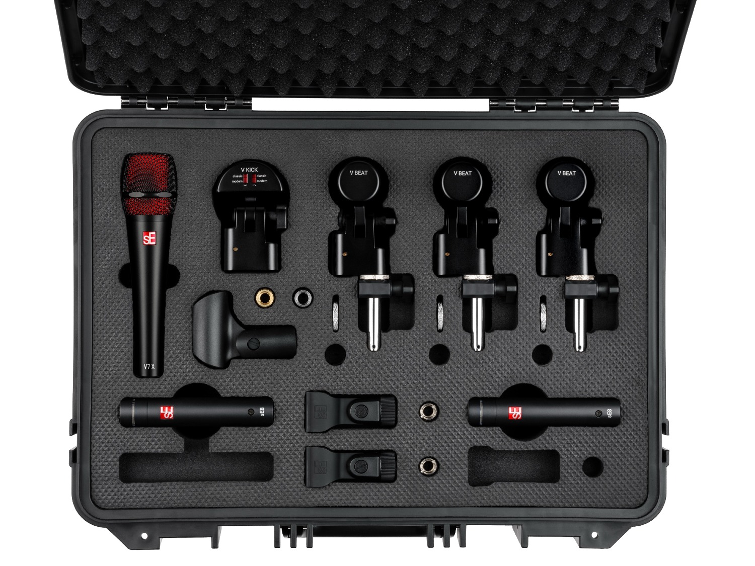 1× V KICK voor basdrum, 3× V BEAT en V CLAMP sets voor toms, 1× V7 X voor snare, plus een bijpassend paar sE8 condensatoren voor overheads. Alle componenten zijn veilig verpakt in een robuuste flightcase die klaar is voor gebruik op de weg, met ruimte voor een optionele hi-hat microfoon.